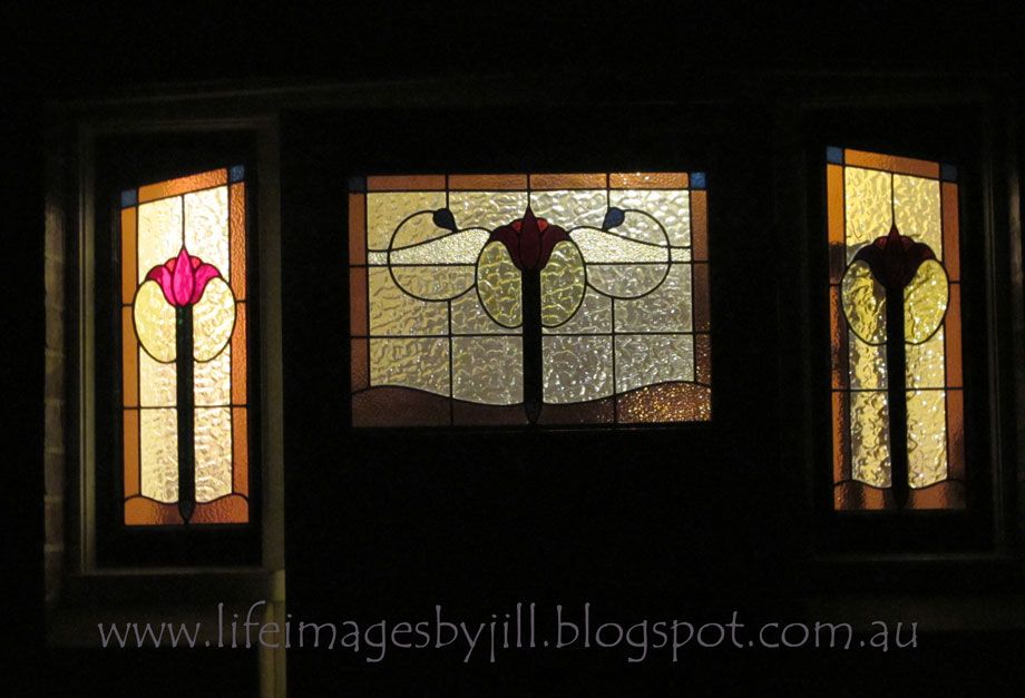Some old stain glass windows and door at a country tavern