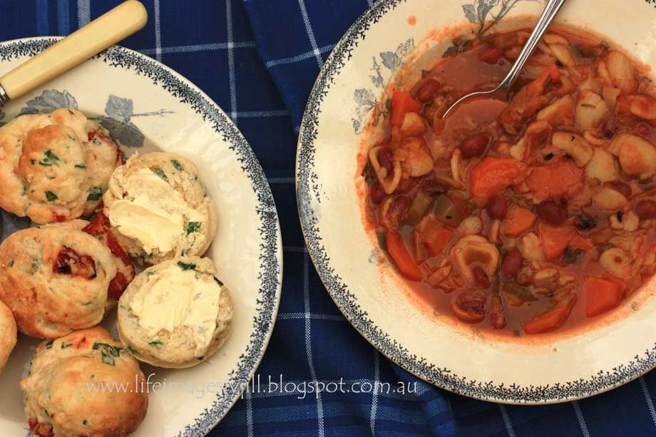 Home made minestrone soup with tomato & herb scones - perfect for a winter's day